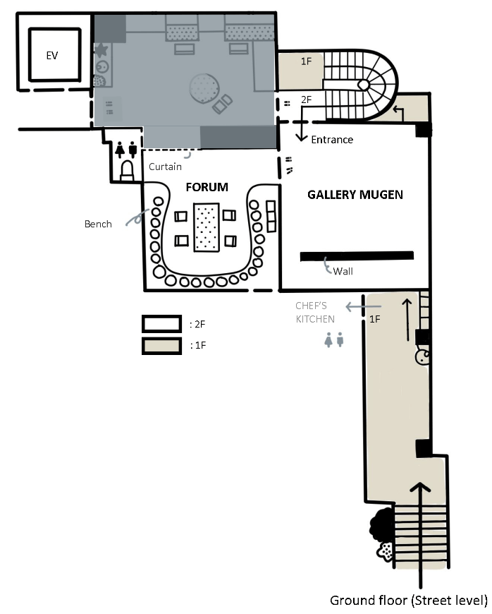 | Facilities (free) | ⚫︎GALLERY MUGEN Wi-Fi, AC, Pendant spot light, Ultra short throw projector, Picture rail ⚫︎Forum Wi-Fi, AC, Chairs, Cushions, Tables, Restroom (available only when Forum is reserved) |