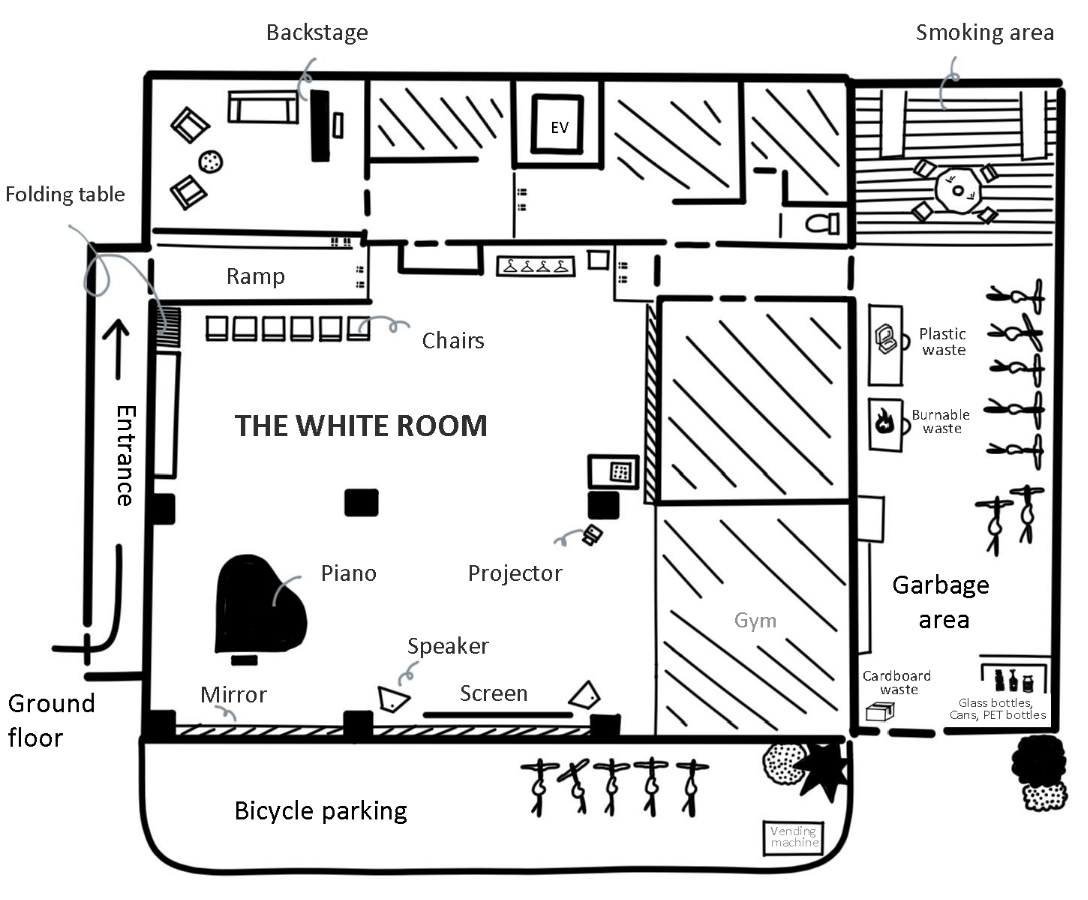 Wi-Fi, AC, Whiteboard, 4K projector, 150-inch screen, Secondary monitor, Mixer, Amplifier, 2 microphones, 3 wireless microphones, 60 chairs, 20 sitting cushions, 10 tables, 3 coolers, grand piano*
